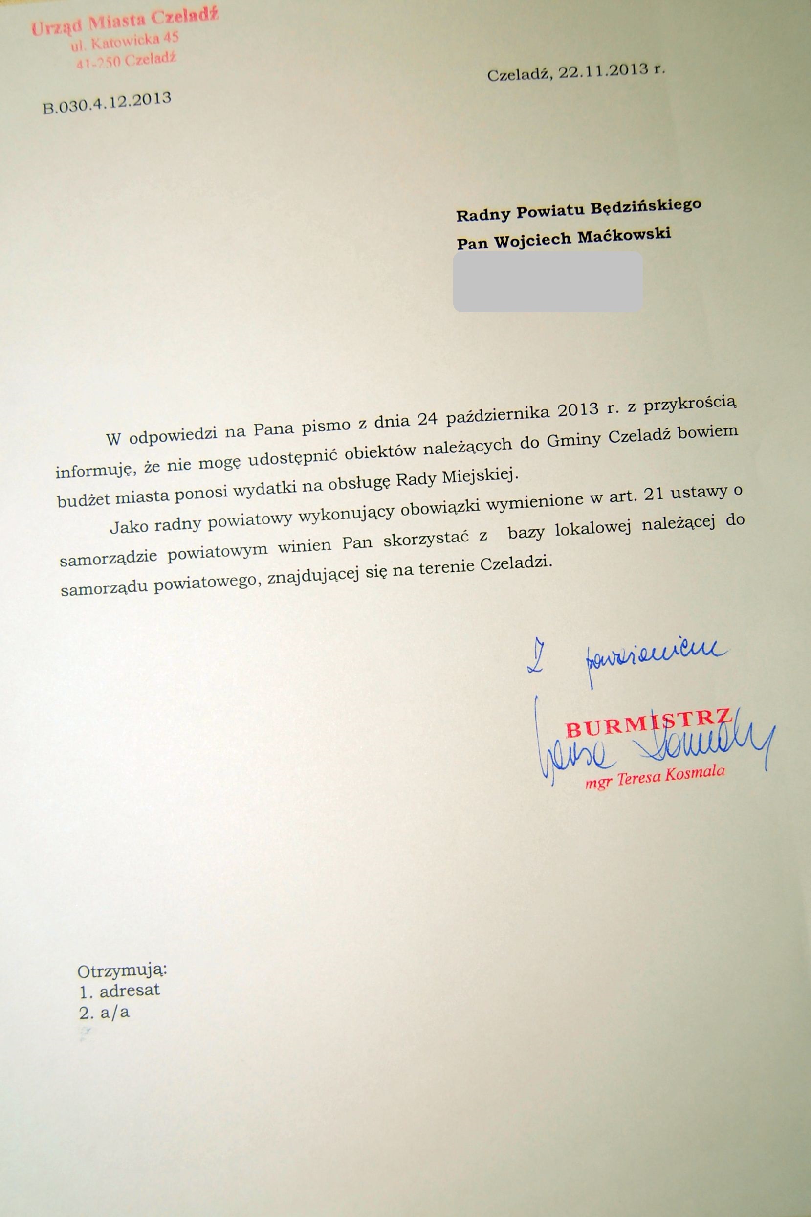 W związku z objęciem mandatu radnego powiatu zwróciłem się w dniu 24 października 2013 r. do pani burmistrz Teresy Kosmali o umożliwienie odbywania dyżurów radnego w Miejskiej Biblioteki Publicznej przy ul. 1-go Maja. Niestety pani Teresa nie wyraziła zgody bowiem… „budżet miasta ponosi wydatki na obsługę Rady Miejskiej”.