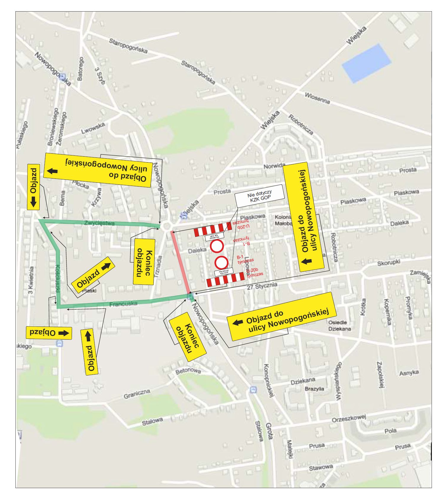 Objazd na odcinku od ronda do skrzyżowania ul. Nowopogońskiej z ul. 27 Stycznia będzie poprowadzony ulicami Zwycięstwa, Kościuszki i Francuską – jak na poniższym schemacie.