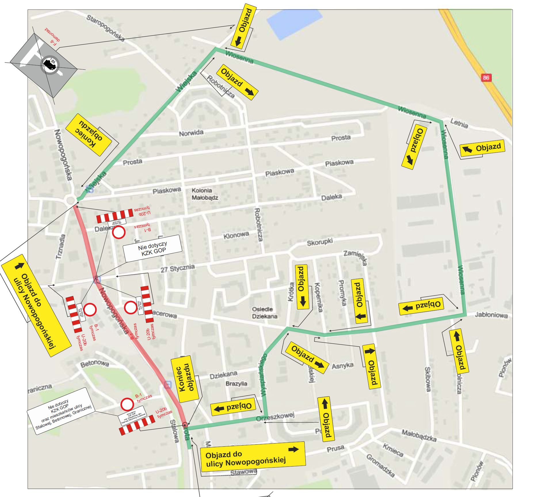 Objazd całego odcinka od granicy z Sosnowcem od ronda będzie poprowadzony ulicami Orzeszkowej, Wyspiańskiego, Spacerową, Wiosenną i Wiejską do ronda – jak na poniższym schemacie.