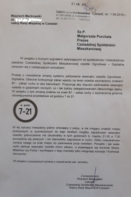 W tym roku w obrębie osiedla Ogrodowa – Szpitalna Czeladzka Spółdzielnie Mieszkaniowa szykuje się do wykonania dodatkowych miejsc postojowych. Ponadto niedawno złożyłem wniosek o rozważenie zmian w systemie postoju i parkowania w obrębie samego osiedla.