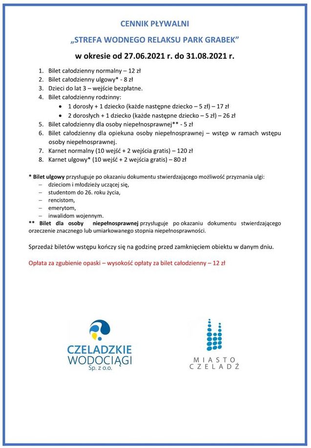 Poniżej cennik za korzystanie z basenu w okresie od 27.06.2021 r. do 31.08.2021 r.
