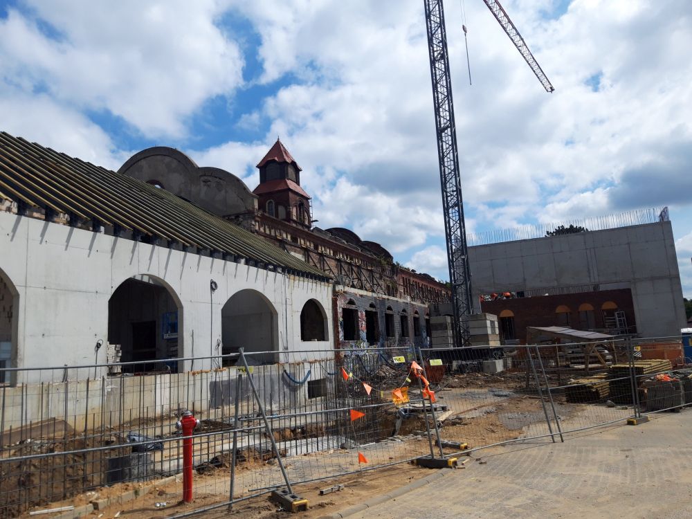 Trwają prace związane z rewitalizacją obiektu. Ściany wewnątrz budynku zostały już oczyszczone z tynku i zbędnych ścianek. Gotowe są też fundamenty pod te fragmenty budynków, które powstają od podstaw, to jest pod szklaną bryłę mediateki oraz część budynku biurowo-restauracyjnego.