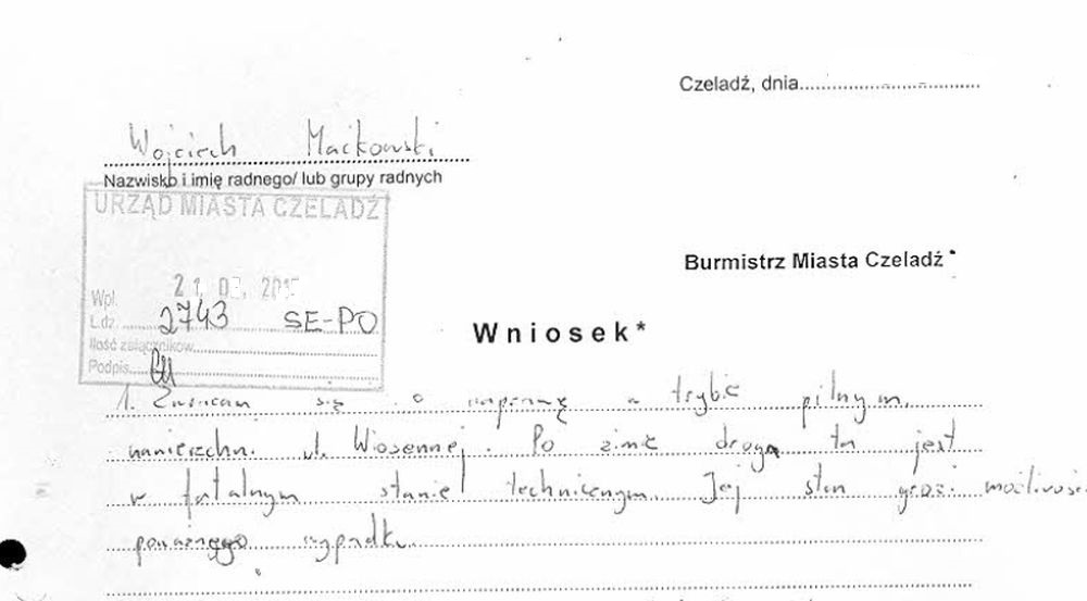 O naprawę wnioskowałem już dość dawno temu, kiedy stan drogi gwałtownie pogorszył się po pracach budowlanych prowadzonych tam przez dewelopera budującego domy jednorodzinne. Dodatkowo stan drogi stale ulegał pogorszeniu na skutek przejazdów ciężkich pojazdów kursujących do okolicznych firm.